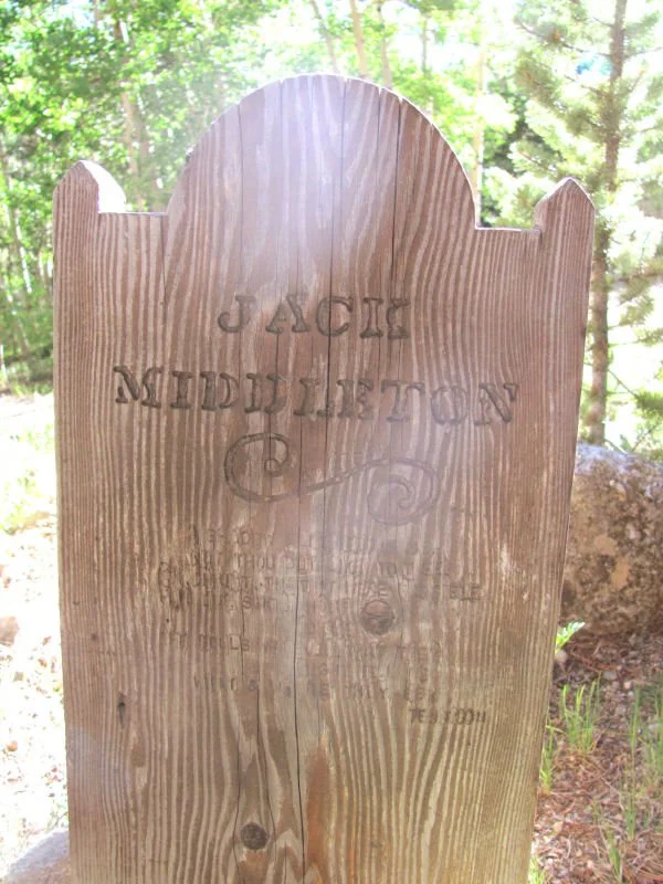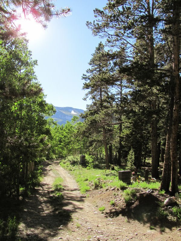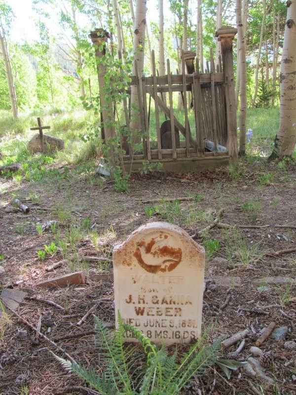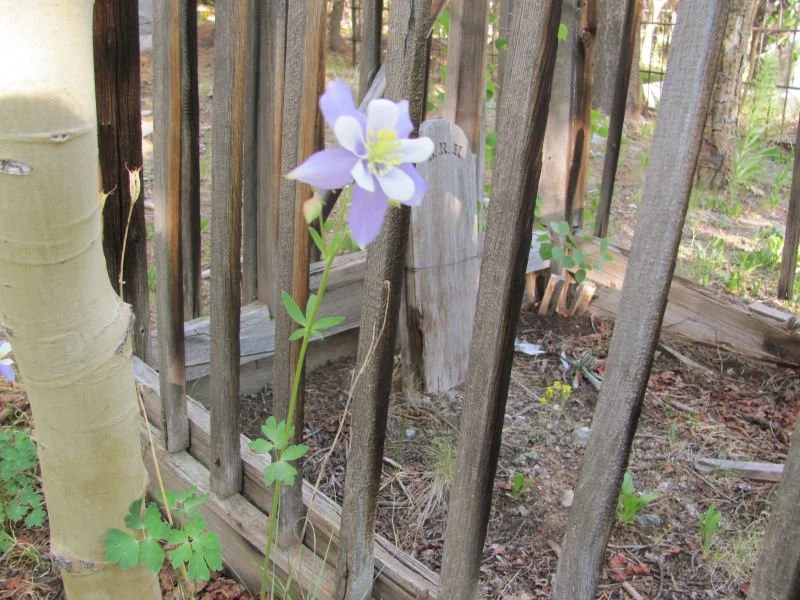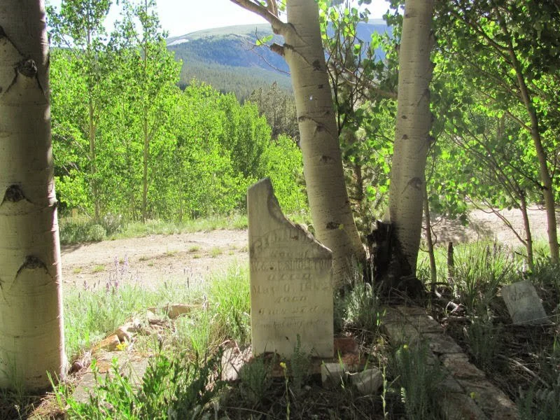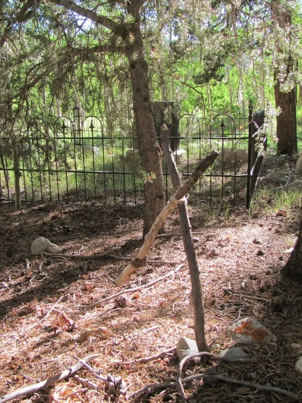The cemetery is most of what remains here of Buckskin Joe. Pale tombstones rise like mushrooms from the forest floor.